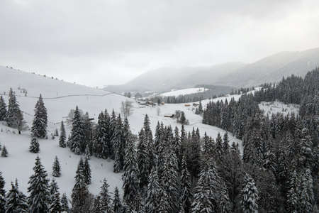 Aerial view of winter landscape with mountain hills covered with evergreen pine forest after heavy snowfall on cold quiet evening