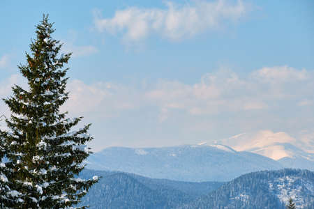 Beautiful winter landscape in the mountains with snow covered pine trees. Happy New Year celebration concept.