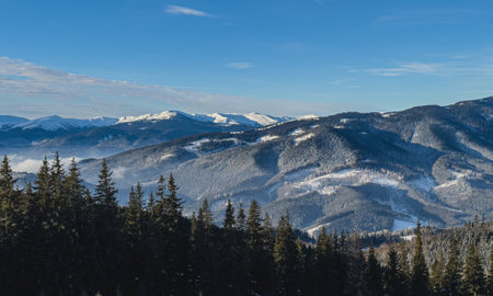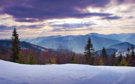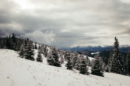 hills covered in snow in the Carpathian mountain range. high evergreen spruce and pine trees. Frosty winter day; dramatic clouds in the blue sky with sun rays