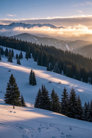 Mesmerizing soothing landscape of hills and mountains covered with snow sunny warm winter evening. Concept of outdoor recreation outside the city in winter. Advertising space