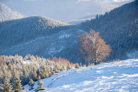 Lonely tree on pasturage in winter mountains. Carpathians, Ukraine