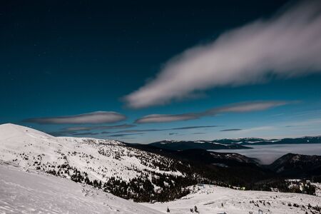 winter mountains with clouds in sunset time. Ski slope, pine tree forest, mount range in the background. Majestic nature landscape. Ski Resort Bukovel, Carpathian Mountains, Ukraine.