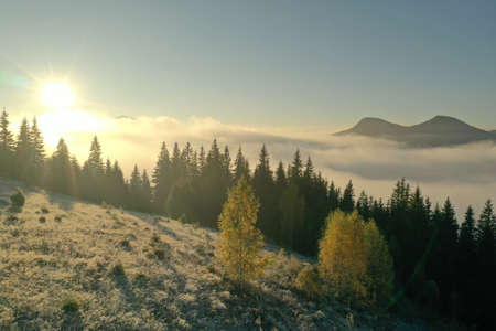 Sun shining over slope covered with hoarfrost in misty mountains. drone photography