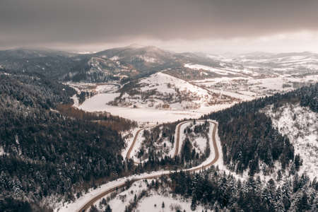 Winter snowy landscape view of a countryroad leading through spruce mountain forest in Slovakian Low Tatry mountains.