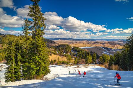 Winter Slovakia. Ski resort Jasna. View from the top of the snow-capped mountains and ski slope with skiers