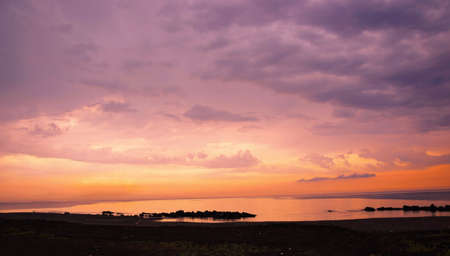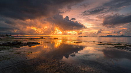 Sunset dramatic sky on tropical desert beach, coral reef reflection no people, travel destination, Indonesia Wakatobi