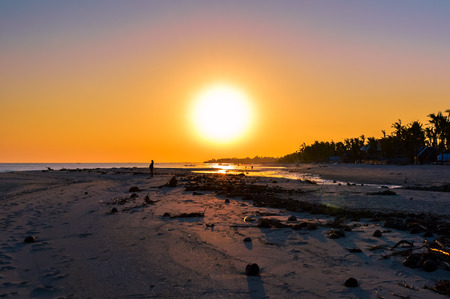 Beautiful sunset on the beach. Silhouettes of pavilions and people. Pandan, Panay island, Philippines