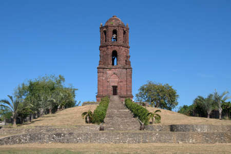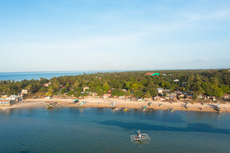 Tropical island with fishing boats over the blue sea. Sandy beaches in coastal area in Bantayan Island. Kota Park in Cebu. Philippines.