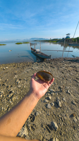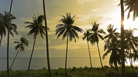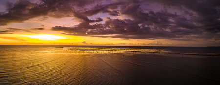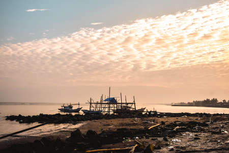 A beautiful shot of a bright yellow sun rising among the silhouettes of a fishing boat on the beach at an exotic tropical sunrise in Panimbang beach, Pandeglang, West Java, Indonesia