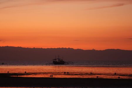 Beautiful sunset on the beach. Local boats standing on the shore. Pandan, Panay island, Philippines