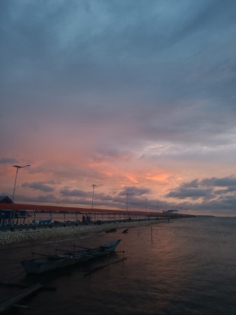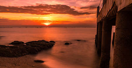 A long exposure landscape of beautiful sunset at the sea beach near concrete bridge with orange sky, clouds and stone