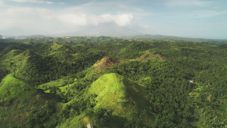 Aerial Philippines hill landscape: nobody wild nature with green tropic forest, abudant plant, high grass, lush mosses. Beautiful asian landmark natural wonder cinematic shooting in drone shot