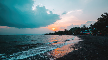 A scenic view of a colorful sunset over the sea, with dramatic teal clouds filling the sky and gentle waves washing ashore on a quiet beach.