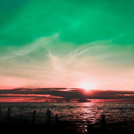 Silhouettes of people on the beach at sunset. City residents are enjoying a weekend by the sea. Dramatic sky and clouds.