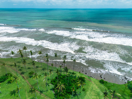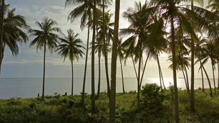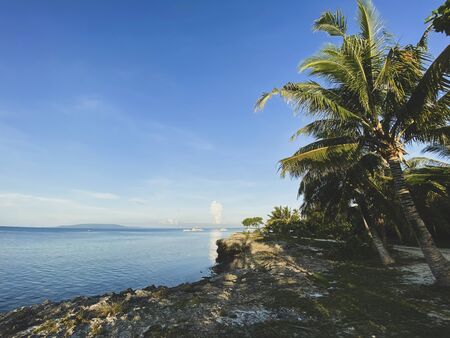 Landscape with coconut trees and turquoise lagoon, view from above. Seascape with palm trees and a pebbly beach, Philippines, Camiguin,aerial view.