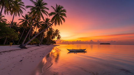 Beautiful sunset on a tropical beach with palm trees and a boat
