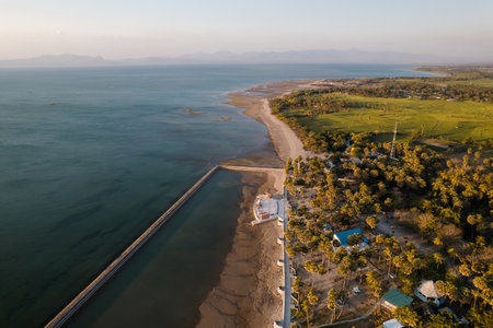 Harbor countryside town on river banks at volcano erupt aerial. Amazing cityscape at sea bay of Mayon Mount, Legazpi, Philippines, Asia. Buildings and cottages at green trees, plants, grass