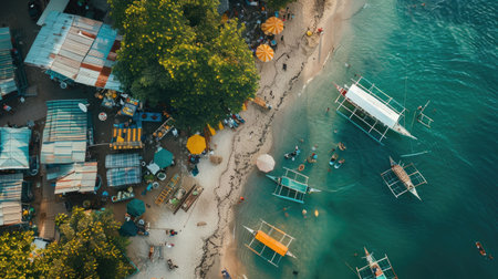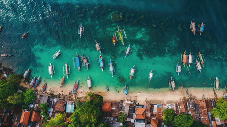 A stunning aerial view of a tropical island with boats floating in the crystalclear water, surrounded by lush greenery and palm trees AIG50