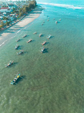 Coast of Cebu island, Moalboal, Philippines, top view. Philippine boats in a blue lagoon over coral reefs. Moalboal is a great place for diving and vacations.