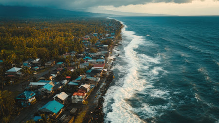 Breathtaking aerial perspective captures a coastal village with colorful roofs surrounded by lush greenery, where waves gently crash against the shore at sunset.