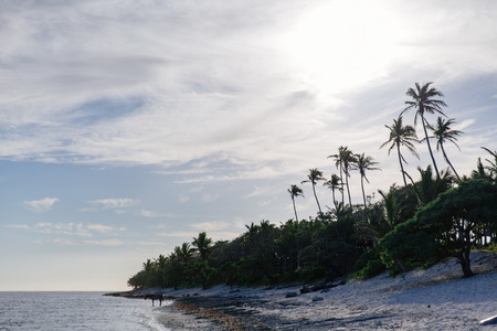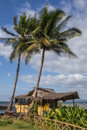 Landscape with palm trees and local houses on the beach. Pandan, Panay island, Philippines.