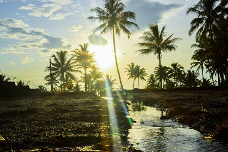 Tropical sunset at the beach with palm trees. Sri Lanka