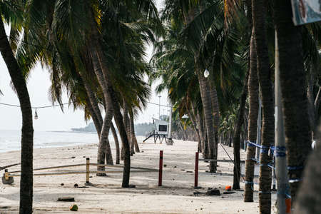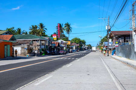 Dumaguete, the Philippines - 07 Apr 2020: empty highway of philippine village during coronavirus quarantine. Modern filipino lifestyle. Stores and stall closed during pandemic community quarantine.