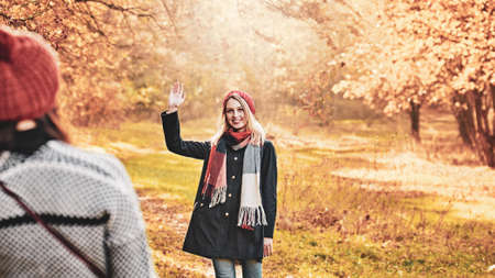 Beautiful young woman in a red hat and scarf with a camera in the autumn forest