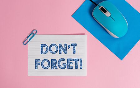 Text sign showing Don T Forget. Business photo showcasing used to remind someone about an important fact or detail Wire electronic mouse striped blank paper sheets clip colored background