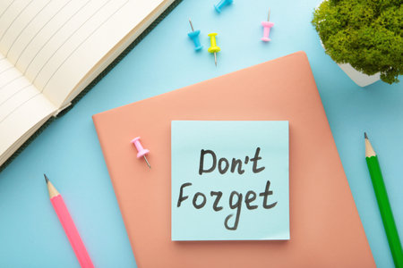 Open notepad and sticky notes with word don't forget on blue background. top view