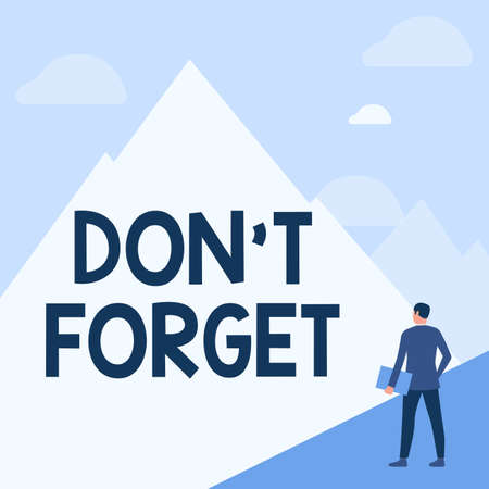 Conceptual caption Don T Forget. Word for used to remind someone about an important fact or detail Gentleman In Suit Standing Holding Notebook Facing Tall Mountain Range.