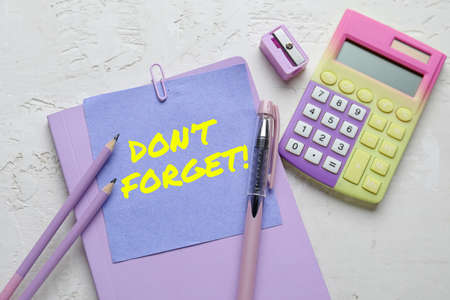 Notebook, paper with text DON'T FORGET, calculator and stationery on light background