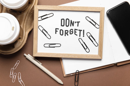Don't forget reminder with notebook, mobile phone and cups of coffee on brown background