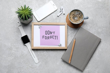 Don't forget reminder with cup of coffee and devices on grunge background