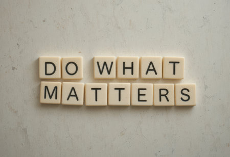 A flat lay image featuring letter tiles arranged to spell DO WHAT MATTERS. This composition inspires motivation and personal growth. Perfect for uplifting projects.