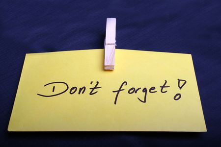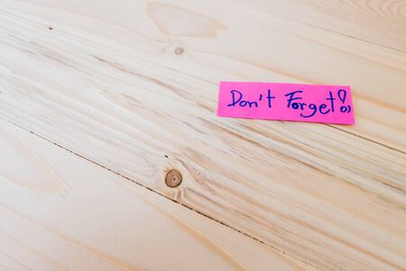 DON'T FORGET text on sticky with coffee, pen and glasses on wooden background