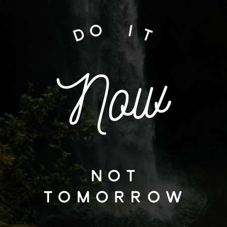 A motivational quote on textured pavement warns against delaying work. Do not postpone today's tasks until tomorrow. This promotes efficiency, self-discipline, productivity, immediate action.
