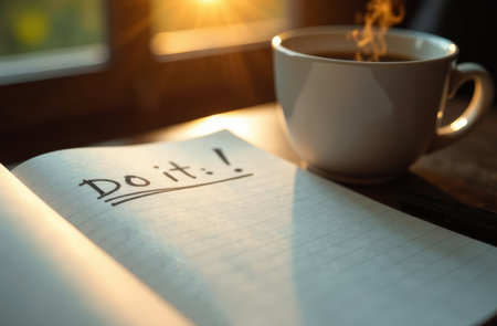 A warm cup of coffee sits beside an open notebook featuring the phrase Do it! in bold handwriting. Soft sunlight illuminates the scene, creating a cozy and inviting atmosphere for productivity..