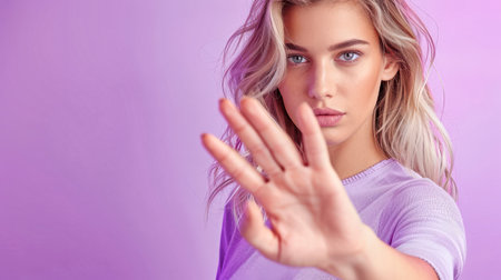 Woman protest against testing products on animals. Serious-looking confident young girl with long wavy hair frowning looking sctrict at camera pulling palm towards camera in prohibition and no gesture
