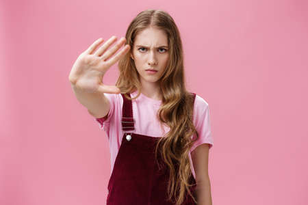 No, enough. Displeased young girl show stop gesture, demanding to cease on pink background. Quarrel, dispute, conflict
