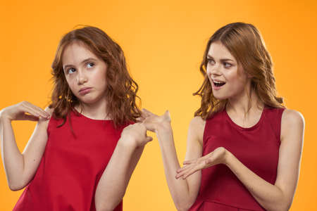 Mom and daughter in red dresses entertainment lifestyle yellow background