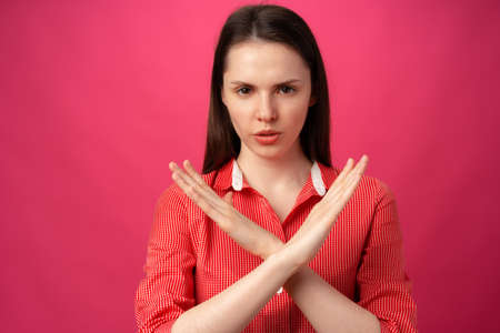 Angry and frustrated woman shows her crossed arms in x gesture sign