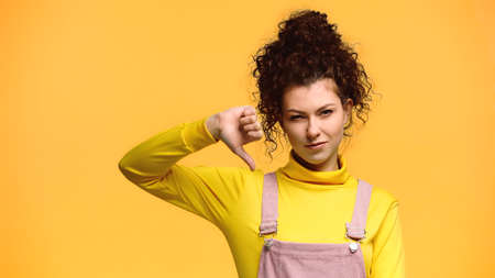 displeased woman showing dislike gesture while looking at camera isolated on orange