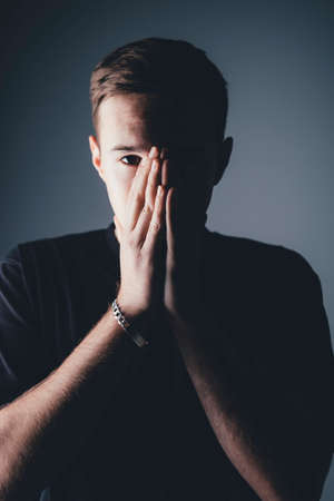 A young man sitting with his hands close to his face and felt sorry for despair in life.