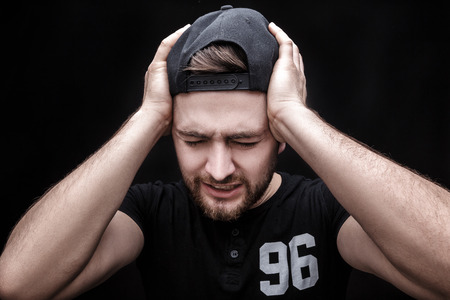 Portrait of a very stressed young man suffering a headache and covering his face on a black background