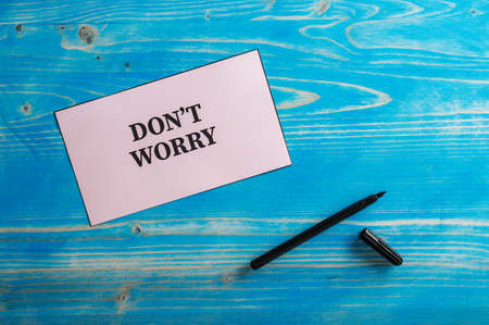 Light pink paper with Dont worry sign on it placed over textured blue wooden background with black marker beside it.