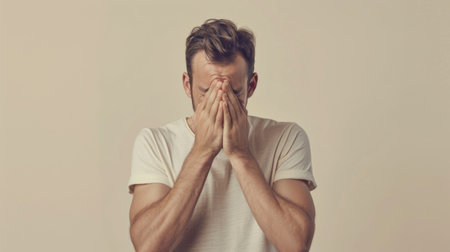 A man with his hands covering his face in a gesture of distress or frustration.