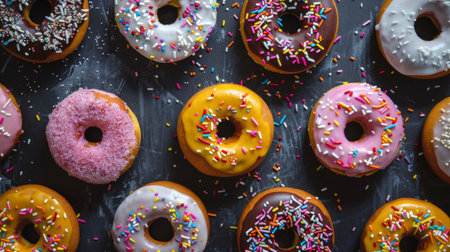 A vibrant display of assorted donuts topped with colorful icing and sprinkles, arranged neatly on a tray for a fun and appetizing aesthetic.