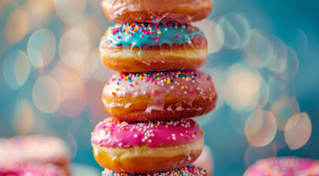 A stack of colorful donuts topped with sprinkles, ready to be enjoyed.