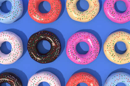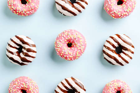 Classic chocolate, pink strawberry, decorated with colorful sprinkles donut isolated on blue background Flat lay Top View Knolling Unhealthy and tasty food concept Holiday card.